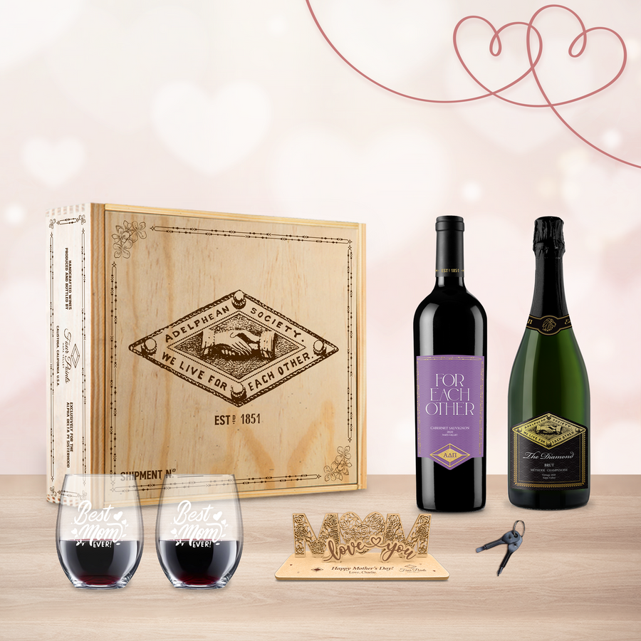 One of our symbols from the very beginning, the diamond is instantly recognizable to all Alpha Delta Pi members, and it is only fitting that our champenoise is named for the brightest of jewels. Our founding sisters included “We Live For Each Other” on their beautiful gold badges as represented on the label. A modern touch is shown in the background with one of the new diamond-inspired patterns created for our recently updated brand.