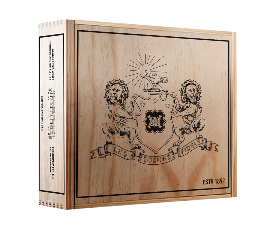 Les Soeurs Fideles fire-branded 3-bottle vintage wooden wine crate, this will also include 2 crate hinges to connect the top lid to the crate so it can open and shut. Please note that the purchase includes the wood crate only, and wine is not included.