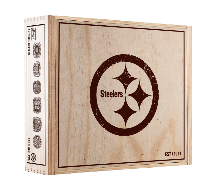 Steel Curtain fire-branded 3-bottle vintage wooden wine crate, this will also include 2 crate hinges to connect the top lid to the crate so it can open and shut. Please note that the purchase includes the wood crate only, and wine is not included.