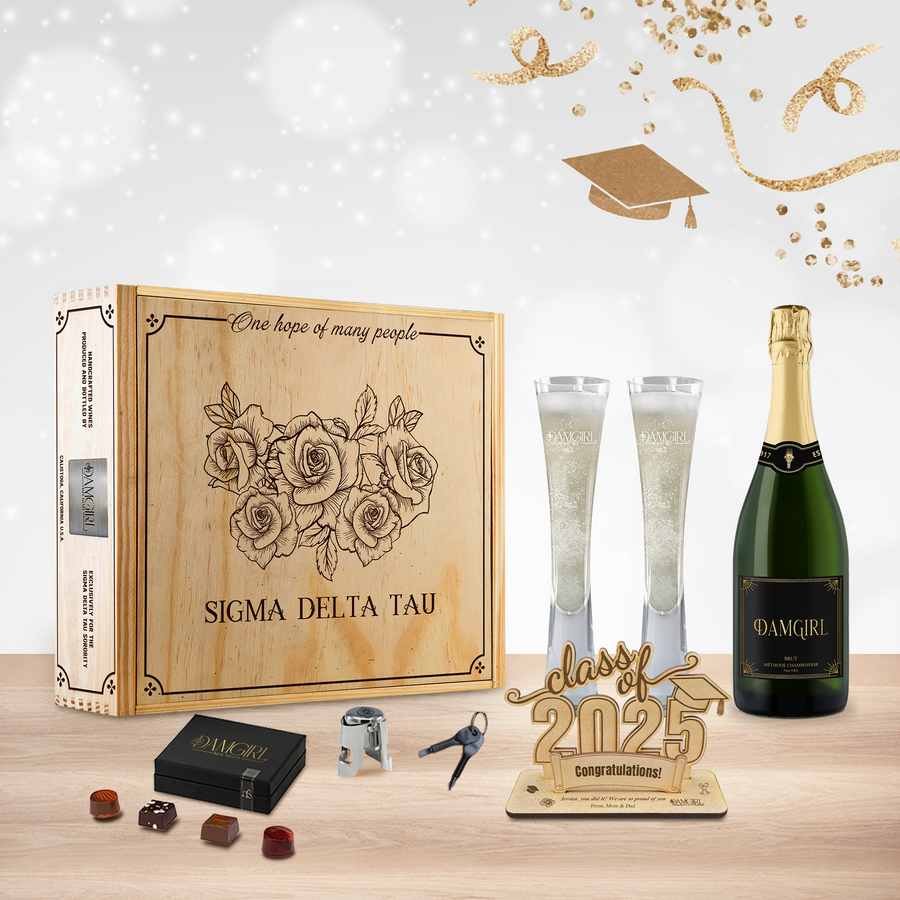Our sparkling wine was created to honor the seven women who founded Sigma Delta Tau at Cornell University in 1917. Each founder brought something unique to the organization and their collective spirit created the legacy our sisters have been gifted. The DAMGIRL acronym was created as a way to highlight and discuss our founders using the first letter of each of their first names. Open a bottle of DAMGIRL wine to celebrate our seven founders and the special occasions in your life.
