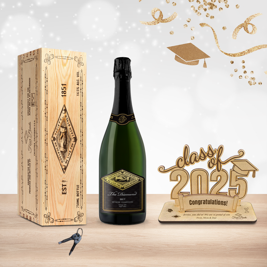 One of our symbols from the very beginning, the diamond is instantly recognizable to all Alpha Delta Pi members, and it is only fitting that our champenoise is named for the brightest of jewels. Our founding sisters included “We Live For Each Other” on their beautiful gold badges as represented on the label. A modern touch is shown in the background with one of the new diamond-inspired patterns created for our recently updated brand.