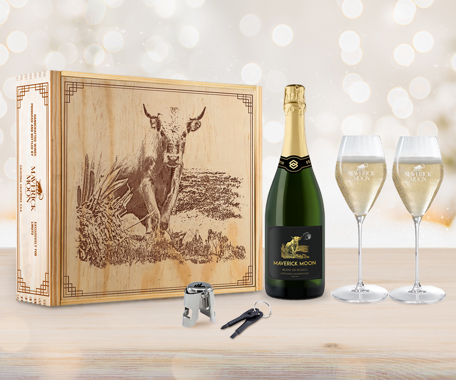 We introduce you to Maverick Moon. This premium sparkling wine – meticulously and artfully made in the traditional champagne method – rivals anything found from the best Champagne houses in Épernay and Reims. Blended superbly from 100% Chardonnay from Carneros, this magnificent Napa Valley Brut exhibits rich fruit aromatics of strawberry and delicate white cherry that follows through to a creamy mid-palate accompanied with highlights of lime and wet minerality and a lingering vibrant finish.