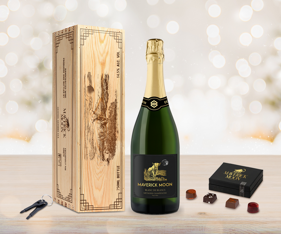 We introduce you to Maverick Moon. This premium sparkling wine – meticulously and artfully made in the traditional champagne method – rivals anything found from the best Champagne houses in Épernay and Reims. Blended superbly from 100% Chardonnay from Carneros, this magnificent Napa Valley Brut exhibits rich fruit aromatics of strawberry and delicate white cherry that follows through to a creamy mid-palate accompanied with highlights of lime and wet minerality and a lingering vibrant finish.