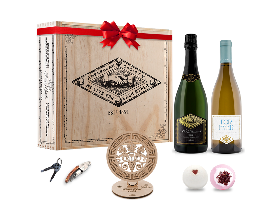One of our symbols from the very beginning, the diamond is instantly recognizable to all Alpha Delta Pi members, and it is only fitting that our champenoise is named for the brightest of jewels. Our founding sisters included “We Live For Each Other” on their beautiful gold badges as represented on the label. A modern touch is shown in the background with one of the new diamond-inspired patterns created for our recently updated brand.