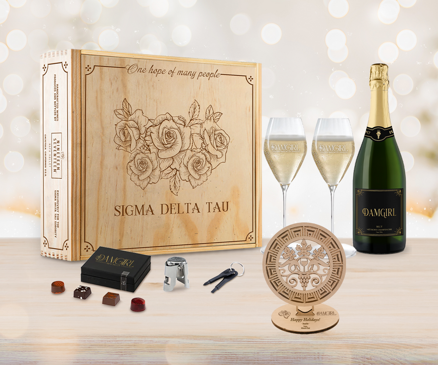 Our sparkling wine was created to honor the seven women who founded Sigma Delta Tau at Cornell University in 1917. Each founder brought something unique to the organization and their collective spirit created the legacy our sisters have been gifted. The DAMGIRL acronym was created as a way to highlight and discuss our founders using the first letter of each of their first names. Open a bottle of DAMGIRL wine to celebrate our seven founders and the special occasions in your life.
