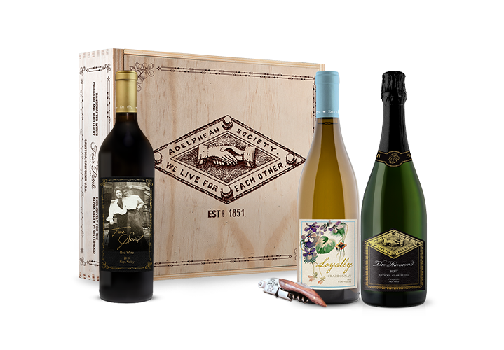 This beautiful label includes an image of Adelphean sisters at Wesleyan circa 1900. The gold border includes our woodland violet as drawn on a 1908 cover of The Adelphean surrounded by a trim from the original sheet music of Marche des Adelphiennes, an 1883 composition written for our earliest sisters.
