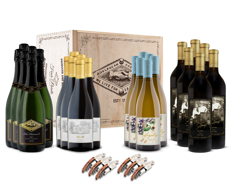 Our Loyally label includes a beautiful watercolor from the cover of a 1909 program from our convention in Georgetown, Texas. Note the Alpha Delta Phi badge represented in the artwork. Our signature azure blue rounds out the design with the border and bottle foil.