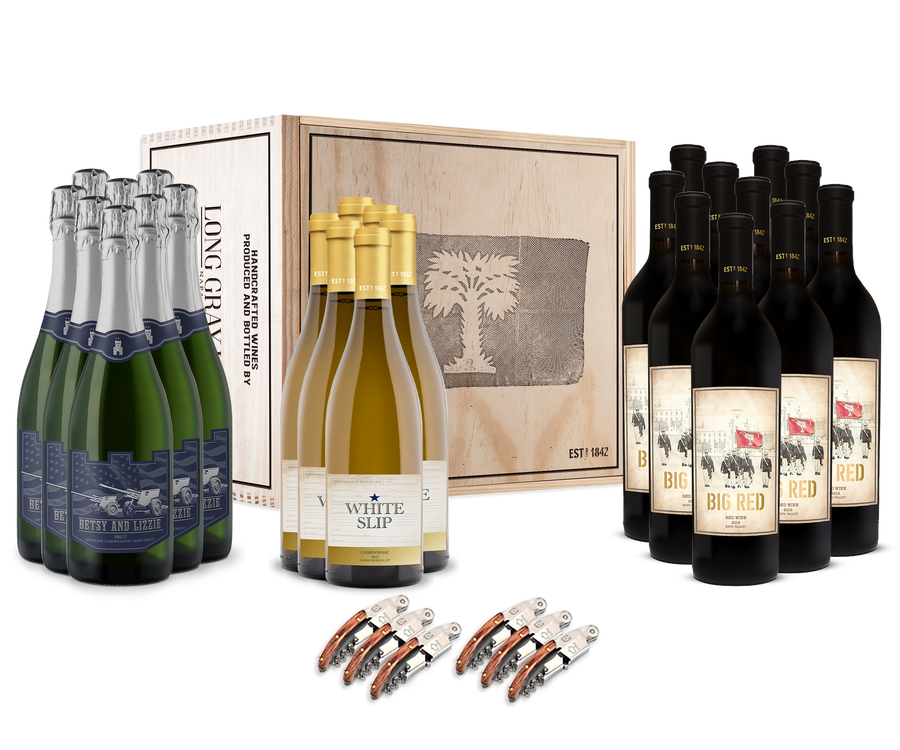 Betsy and Lizzie, the two salute guns fired during The Citadel’s parades, are named for the wives of Citadel alumni George Edward Haynsworth and Samuel Bonneau Pickens. While nothing is quite as impressive as firing cannons in celebration, popping the cork on a bottle of Betsy and Lizzie Brut sparkling wine is most certainly a close second.