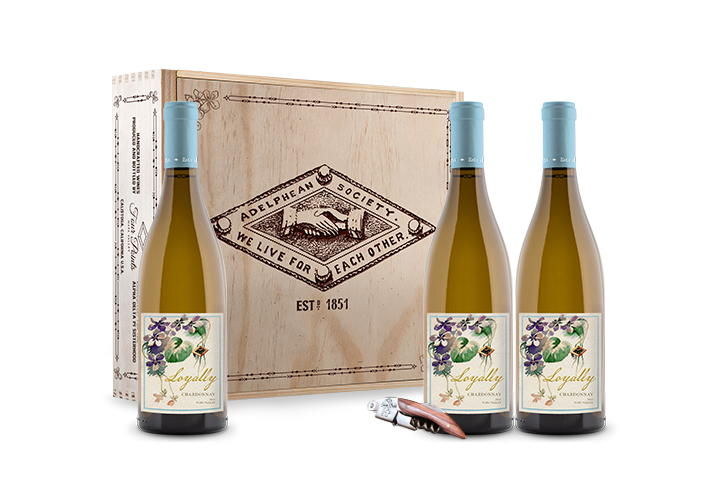 Our Loyally label includes a beautiful watercolor from the cover of a 1909 program from our convention in Georgetown, Texas. Note the Alpha Delta Phi badge represented in the artwork. Our signature azure blue rounds out the design with the border and bottle foil.