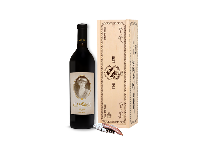 This beautiful red wine gift box features our Founder Ms. Amelia - 2018 Red Wine - Napa Valley. The bottle is nestled in wood wool inside a single-bottle True North vintage wine crate and includes a True North 4-pc Napa Valley truffle set, wine key, crate hinges, and vintage card postmarked with the founding year of Theta Phi Alpha along with your personalized gift message.