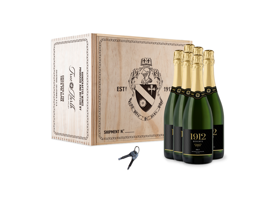 We introduce you to 1912 Reserve. This premium sparkling wine – meticulously and artfully made in the traditional champagne method – rivals anything found from the best Champagne houses in Épernay and Reims. Blended superbly from Chardonnay and Pinot Noir, this magnificent Napa Valley Brut exhibits rich fruit aromatics of strawberry and delicate white cherry that follows through to a creamy mid-palate accompanied with highlights of lime and wet minerality and a lingering vibrant finish.