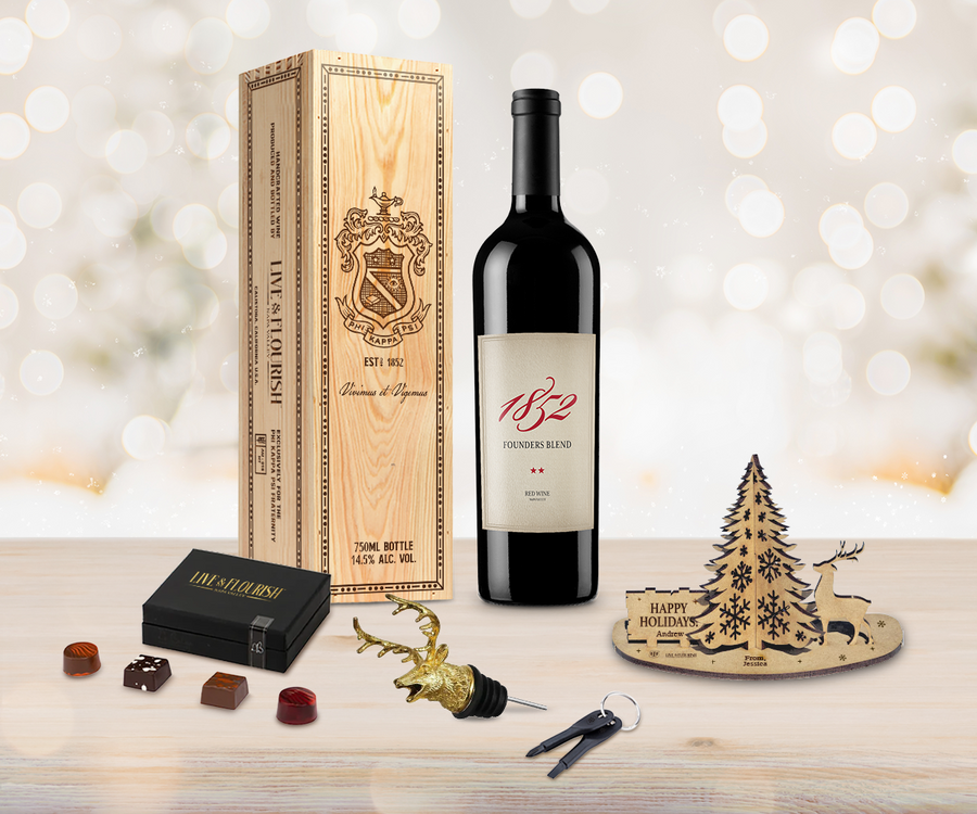 We introduce you to our 1852 Founders Blend. This proprietary red blend – from our award-winning winemaker Todd Heth – exhibits dark blackberry, bing cherry, and plum notes perfectly into layers of coffee and tobacco. The finish is dry with long-lasting berry fruit. Silky but firm tannins, this wine is enjoyable now but has the ability to age well in the cellar.