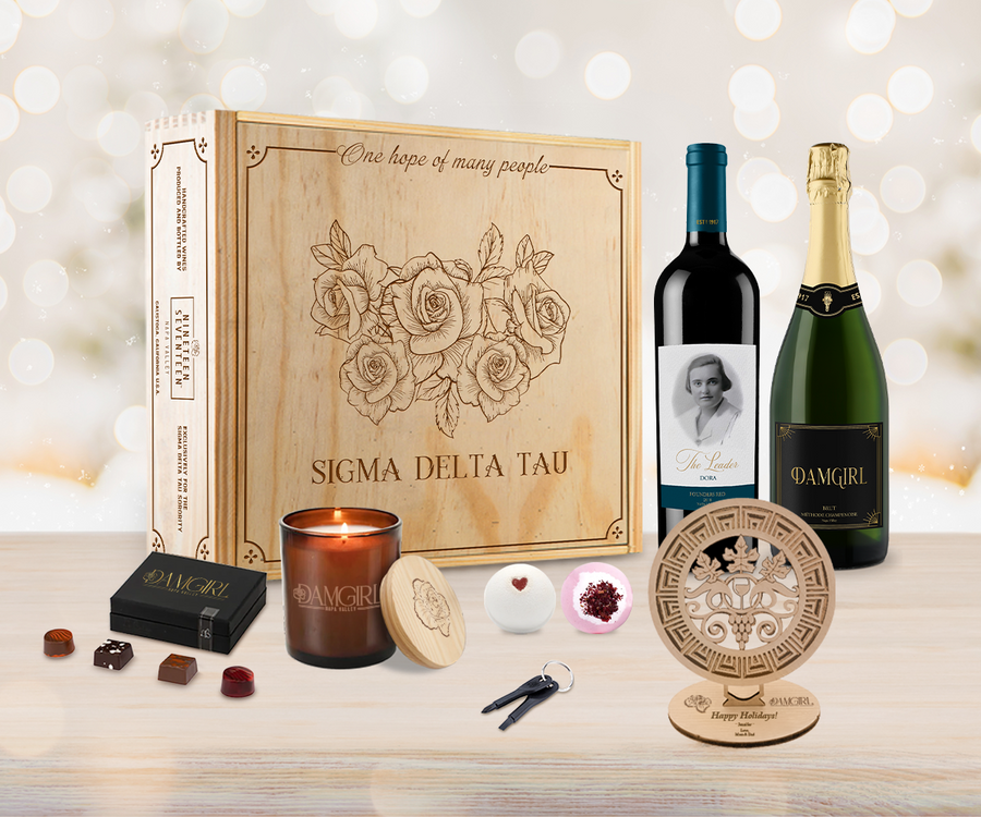 Our sparkling wine was created to honor the seven women who founded Sigma Delta Tau at Cornell University in 1917. Each founder brought something unique to the organization and their collective spirit created the legacy our sisters have been gifted. The DAMGIRL acronym was created as a way to highlight and discuss our founders using the first letter of each of their first names. Open a bottle of DAMGIRL wine to celebrate our seven founders and the special occasions in your life.