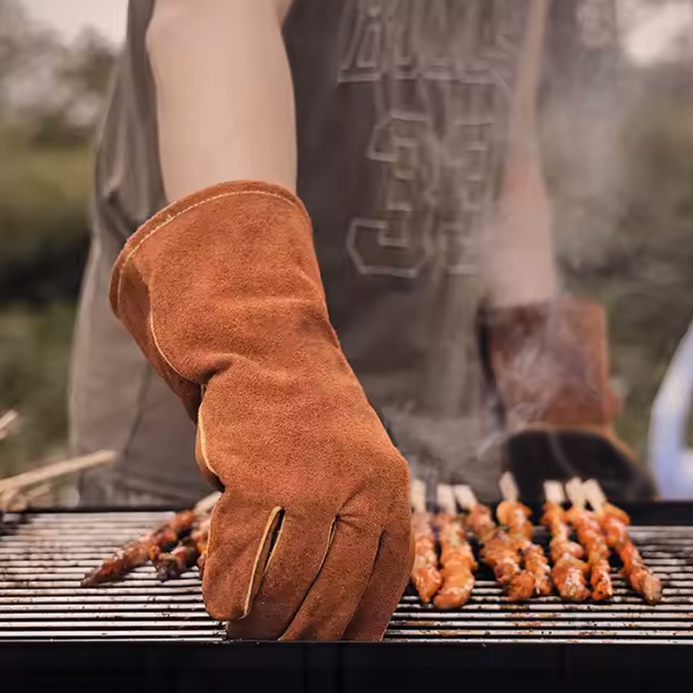 Heat-Resistant Leather Suede BBQ Grilling Gloves