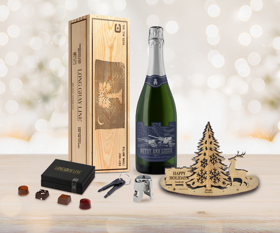Betsy and Lizzie, the two salute guns fired during The Citadel’s parades, are named for the wives of Citadel alumni George Edward Haynsworth and Samuel Bonneau Pickens. While nothing is quite as impressive as firing cannons in celebration, popping the cork on a bottle of Betsy and Lizzie Brut sparkling wine is most certainly a close second.