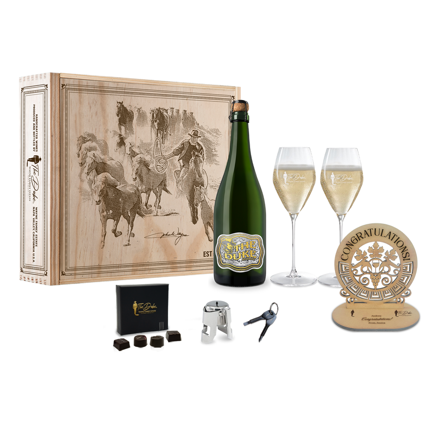 More significant than any screen performance was John Wayne’s real-life commitment to the brave men and women of our United States Armed Forces. John Wayne represented the heart of America by showing his unwavering appreciation to military service members sacrificing their lives by participating in USO tours during World War II and the Vietnam War. Duke would perform and meet with soldiers, giving them a bit of home and a reason to press on.“I am an old-fashioned, honest-to-goodness, flag waving patriot.” – John WayneWe introduce you to The Duke. Our premium sparkling wine – meticulously and artfully made in the traditional champagne method – rivals anything from the best Champagne houses in Épernay and Reims. Join us and toast to the men and women of our Armed Forces that have fought and died preserving our liberty and justice for all. Retail Price: $85.00 / 750 ml The Duke Wine Club Member Price: $65.00 / 750 ml