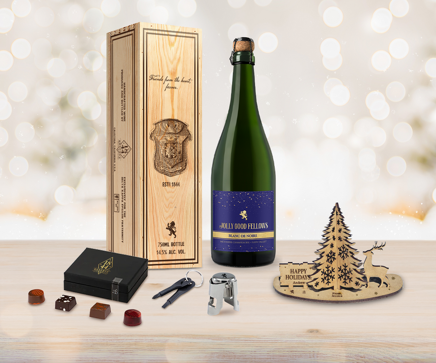 We introduce you to Jolly Good Fellows. This premium sparkling wine – meticulously and artfully made in the traditional champagne method – rivals anything found from the best Champagne houses in Épernay and Reims. Blended superbly from Chardonnay and Pinot Noir, this magnificent Napa Valley Brut exhibits rich fruit aromatics of strawberry and delicate white cherry that follows through to a creamy mid-palate accompanied with highlights of lime and wet minerality and a lingering vibrant finish.