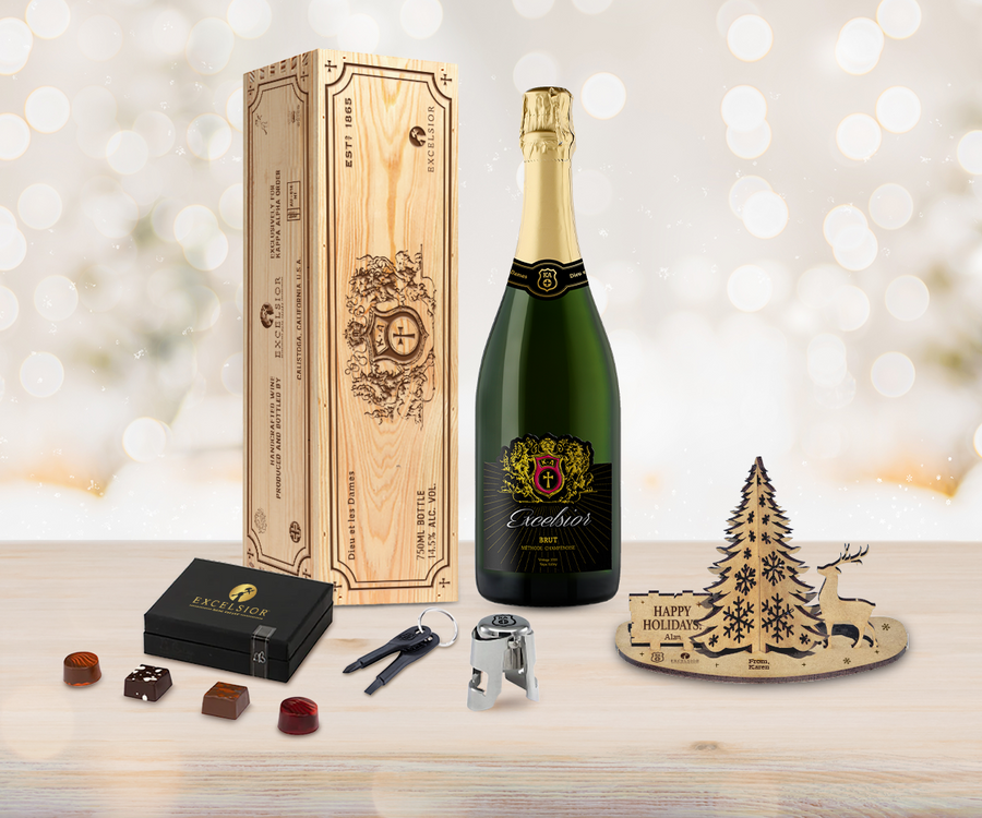 We introduce to you, Excelsior. This premium sparkling wine – meticulously and artfully made in the traditional champagne method – rivals anything found from the best Champagne houses in Épernay and Reims. Blended superbly from Chardonnay and Pinot Noir, this magnificent Napa Valley Brut exhibits rich fruit aromatics of strawberry and delicate white cherry that follows through to a creamy mid-palate accompanied with highlights of lime and wet minerality and a lingering vibrant finish.